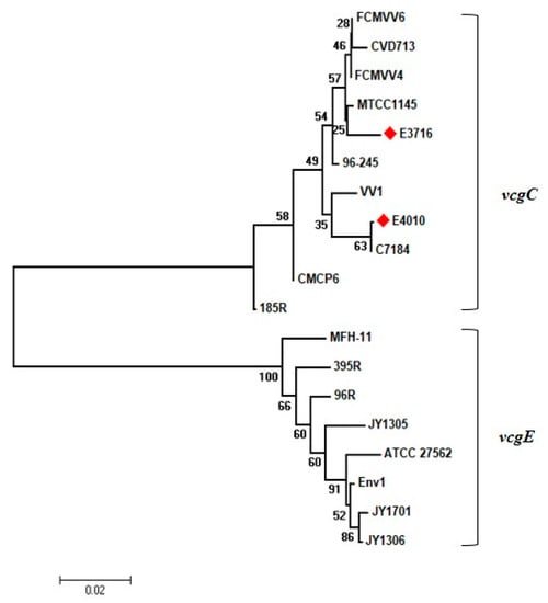 Phylogeny was estimated in the Molecular Evolutionary Genetics Analysis (MEGA) program, Version 5.0 by the Neighbor-joining method (p-distance) using the sequence information obtained from the NCBI GenBank database along vcg alleles sequenced in this study (V. vulnificus E3716 and E4010).