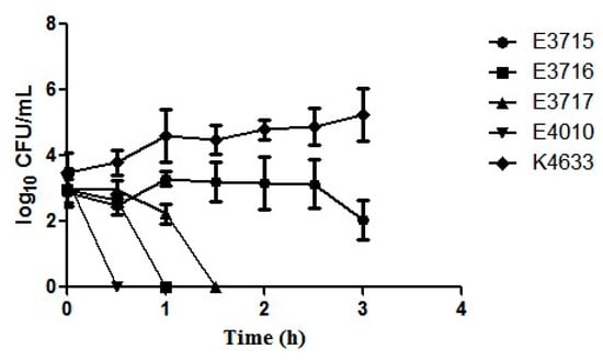Four environmental and one clinical strain were examined for their ability to overcome the inhibitory effects and survival in undiluted serum. A significant difference was seen in the survivability between seafood and clinical isolates (p < 0.001). The clinical isolate successfully resisted the bactericidal activity of serum showing a 2 log increase at the end of 3 h. The seafood isolates E4010, E3716, E3717 lost their viability within 0.5, 1 and 1.5 h, respectively, whereas E3715 survived until 3 h, but with a 1 log reduction (Figure 3). Additionally, isolate E4010 was checked for the ability to survive in different dilutions of serum. A total of 6.25% and 12.5% of serum was resisted by the bacteria, whereas 25% and 50% serum proved lethal, with the cells losing their viability within 1 and 0.5 h, respectively (data not shown). Inactivated serum did not inhibit the survival and replication of the bacteria (data not shown).