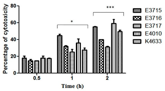 HeLa cells were infected with V. vulnificus at a multiplicity of infection (MOI) of 5. Percentage of cytotoxicity was measured at 0.5, 1, and 2 h of postinfection by LDH release assay. The data represents means and standard errors from three independent experiments. Factorial ANOVA was performed to analyze the difference between the strains (* p < 0.05 and *** p < 0.001).