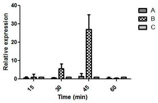 Relative expression of the rtxA1 gene in seafood isolate E4010 (A) V. vulnificus grown in Luria Bertani (LB) broth overnight at 37 °C incubated in Dulbecco’s Modified Eagle’s Medium (DMEM), (B) V. vulnificus grown in LB broth overnight at 37 °C was used to infect to HeLa cells at an MOI of 1:5, and (C) HeLa cells harvested at 0 h postinfection (control).
