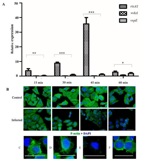 Effect of adhering V. vulnificus on F-actin network and nucleus of HeLa cells at different time points. HeLa cell monolayers were infected at an MOI of 5 and incubated for 1 h at 37 °C. (A) The relative expression level of rtxA1, vvhA and vvpE at the time of infection. Results are mean ± SD of triplicate experiments. Asterisks indicate significant differences in the expression of genes (* p < 0.05, ** p < 0.01 and *** p < 0.001). (B) Immunofluorescence images of HeLa under 20×. Scale bar corresponds to 50 µM. Images are overlays of actin (green) and nucleus (blue) signals. Descriptive features of HeLa cell at 1 h of postinfection; blebbing (C), discrete actin bundles (D), diffuse actin bundles (E), cell rounding (F).