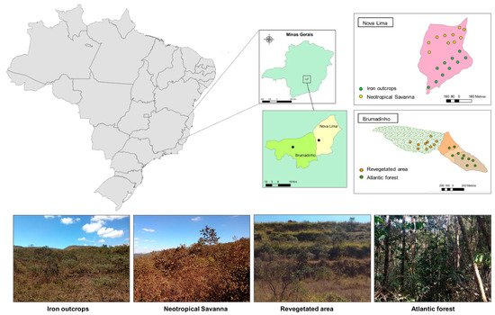 The state of Minas Gerais, in central Brazil, has strong ties to mining activity, and iron mining is the basis of the economy of several municipalities. Mining activities in general account for 5 to 6% of Brazil’s total gross domestic product [12,13]. The state of Minas Gerais has significant mineral deposits concentrated mainly in the region known as the Iron Quadrangle (Quadrilátero Ferrífero), which occupies about 7000 km2 of the southeastern portion of the state. The region has a great species richness of vascular plants, with its vegetation cover shared between the Neotropical Savanna and Brazilian Atlantic Forest biomes. The Brazilian Atlantic forest biome is currently very degraded, being mainly represented by fragments of vegetation. The Neotropical Savanna is composed of a mosaic of phytophysiognomies, ranging from forest areas to open areas with very sparse vegetation. The prevailing hot climate in the Iron Quadrangle (Cwa—humid temperate, according to Köppen’s classification), has an average annual temperature of 20 °C, and precipitation ranging from 1300 to 2100 mm per year. The region has two well-defined seasons: dry winter and rainy summer [14].