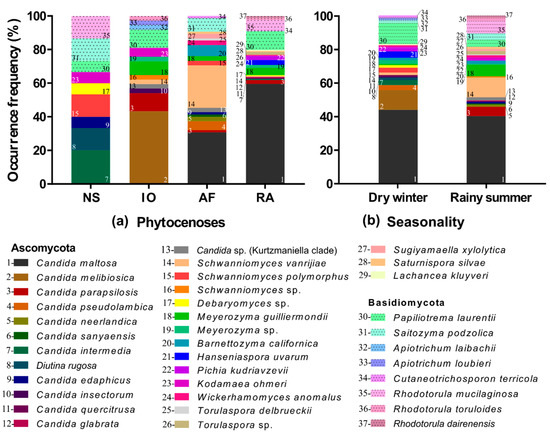 Yeast species composition by phytocenoses (a), and seasonality (b). NS: Neotropical savanna, IO: Iron outcrops, AF: Atlantic forest, and RA: Revegetated areas.