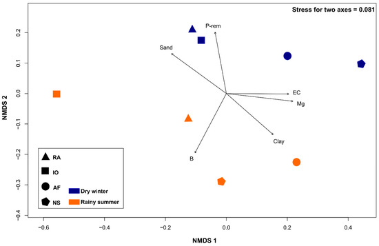 Nonmetric multidimensional scaling (NMDS) plot tracking community similarity by phytocenoses and seasonality. NS: Neotropical savanna, IO: Iron outcrops, AF: Atlantic forest, and RA: Revegetated areas. Soil variables (permutation test < 0.05)—Mg: magnesium, B: boron, P-rem: remaining phosphorus, EC: electrical conductivity, and texture (sand, clay).