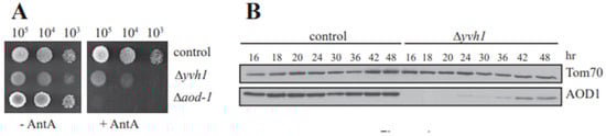 Growth of Δyvh1 cells and induction of AOD1. (A) Growth rate of Δyvh1. Ten fold serial dilutions of conidia (numbers indicated at top of panel) from a wild type positive control strain (NCN251), a negative control strain (Δaod-1) and Δyvh1 were spotted onto plates and incubated at 30 °C for 48 h on standard growth medium (−AntA) and for 68 h on medium containing AntA (+AntA). (B) Western blot analysis for the appearance of AOD1. Mitochondrial fractions were isolated from the control strain (NCN251) and Δyvh1 after growth in the presence of Cm for the specified times. Proteins were separated by SDS-PAGE, blotted to nitrocellulose membrane and probed with the antibodies indicated on the right. TOM70 [62], an outer mitochondrial membrane protein, was used as a loading control.