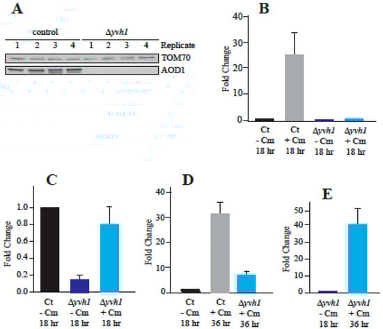 Levels of aod-1 transcript in Δyvh1. (A) Western blot analysis of biological replicates of the control strain (NCN251) and Δyvh1 grown in the presence of Cm for 18 hr. This was done as a control to insure that the 18 h mutant samples contained little to no detectable AOD1 protein prior to qPCR analysis. Mitochondria were isolated from the replicates and mitochondrial proteins were separated by SDS-PAGE, blotted to nitrocellulose membrane, and probed with the antibodies indicated on the right. RNA was also isolated from each replicate for use in qPCR analysis. (B–E) qPCR of aod-1 transcript levels in control (Ct, NCN251) and Δyvh1 grown in the presence or absence of the inducer Cm (+Cm or −Cm) for 18 h or 36 h as indicated. In each panel the fold increase or decrease is shown relative to the first data set in that panel. Black bars indicate the control strain grown in the absence of Cm while grey bars indicate the control grown in the presence of Cm. Dark blue bars show the Δyvh1 mutant grown in the absence of Cm and light blue bars indicate the mutant grown in the presence of Cm. Error bars represent 95% confidence intervals. Fold change values were relative to the control (NCN251) grown in the absence of Cm for 18 h (B–D) or Δyvh1 grown in the absence of Cm for 18 h (E). Samples were normalized to GAPDH based on the ΔΔCT-method.