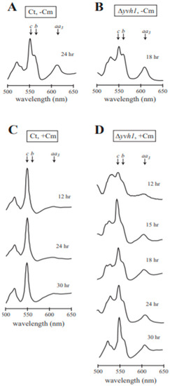 It was conceivable that the reduced production of AOD1 in Δyvh1 was due to inefficient inhibition of mitochondrial protein synthesis by Cm in the mutant strain, relative to the efficient inhibition by Cm in wild type cells. This would allow the sETC to function to a greater extent than in wild type cultures grown in the presence of Cm. The possibility was investigated by performing a qualitative examination of mitochondria for the spectrally detectable components of the electron transport chain, cytochromes aa3, b, and c. Mitochondrial translation products include cytochrome b of complex III and three proteins of cytochrome aa3, the spectral component of complex IV of the sETC [63]. Cytochrome c consists of a single polypeptide that is encoded in the nucleus, translated on cytosolic ribosomes, and imported into the mitochondria [64,65,66,67], and is therefore unaffected by the action of Cm, which inhibits mitochondrial protein synthesis. When grown under non-inducing conditions, mitochondria from wild type cells contained distinguishable peaks for cytochrome c, cytochrome b, and cytochrome aa3 as shown for the control strain NCN251 (Figure 3A). A similar pattern of these cytochromes was observed in mitochondria of the Δyvh1 strain grown in the absence of Cm (Figure 3B). As observed previously [23,28], when the wild type control was grown in the presence of Cm, the peaks for cytochrome b and cytochrome aa3 were severely reduced due to the decreased formation of mitochondrial translation products, while the nuclear encoded, cytosolically translated cytochrome c, was still present (Figure 3C). When the Δyvh1 strain was grown in the presence of Cm, the peaks for cytochrome aa3 and cytochrome b were somewhat reduced relative to the amount of cytochrome c (Figure 3D), but not to the extent observed in the control cultures grown in the presence of Cm (compare Figure 3C,D). These observations suggest that Cm may be affecting Δyvh1 mitochondrial translation to a lesser extent than in the control. This could help explain the slow accumulation of the AOD1 protein in the Δyvh1 mutant (Figure 2B) since more time might be required to accumulate a sufficient concentration of an unknown inducing signal for aod-1 expression that accumulates when sETC function is decreased.