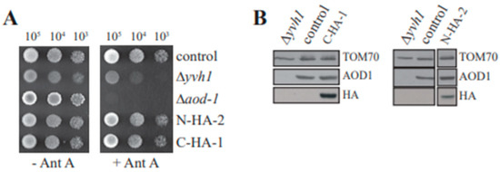 Transformants of Δyvh-1 expressing the 3xHA-tagged versions of YVH1 have growth rates and AOD1 expression similar to wild type cells. (A) Growth of strains N-HA2 and C-HA-1. Serial dilutions of conidia (indicated at top of panel) from the indicated strains were spotted on plates and incubated at 30 °C for 48 h on standard medium (−AntA) or 68 h on medium containing AntA (+AntA). The control strain is NCN251. (B) Western blot analysis of 3xHA-tagged strains. Cultures were grown in the presence of Cm for 20 hr. Crude mitochondrial and cytosolic fractions were prepared from the indicated strains. Proteins were separated by SDS-PAGE, and blotted to nitrocellulose membranes. The crude cytosolic fractions were probed with HA antibody. The mitochondrial fractions were probed with antibodies to AOD1 and Tom70 (loading control). Irrelevant lanes from the right portion of the panel were removed electronically.