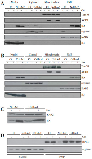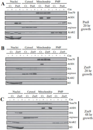 The P-mutant strain 8 (Pm8) and the Z-mutant strain 9 (Zm9) were then used in subcellular fractionation experiments to determine the localization of the altered protein. The mutant YVH1 protein in Pm8 was found in the nuclear and PMP fractions (Figure 7A), as were the N- and C-terminal HA tagged wild type versions of YVH1 (Figure 5A,B). AOD1 levels in the mitochondrial fraction were similar to the control when the cells were grown in the presence of Cm. These data reinforce the idea that YVH1 does not require a functional phosphatase domain to allow expression of AOD1 to control levels when cells are grown in the presence of Cm.