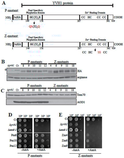 Analysis of phosphatase domain (P-mutants, Pm) and zinc binding domain (Z-mutants, Zm) mutants. (A) Representation of the N. crassa N-terminally 3xHA tagged YVH1 protein showing the position of amino acid changes introduced to create the P- and Z-mutants. The amino acid changes in the P-mutant are H149Q, C150S, and R156Q. The amino acid changes in the Z-mutants are C340S and C345S. The HA tag was not considered in the numbering of the amino acids. Changed amino acids are shown in red. (B) The 3xHA tagged mutant versions of YVH1 are expressed in isolated transformants of the Δyvh1 mutant. Whole cell extracts were prepared from the Δyvh1 strain, the NCN251 control (Ct), five isolates of P-mutant transformants, and five isolates of Z-mutant transformants. Cells were grown for 20 h in the presence of Cm. Proteins present in the cell extracts were separated by SDS-PAGE and blotted to nitrocellulose membranes. The blots were examined for HA and the loading control arginase. The * symbol indicates non-specific binding to an unknown protein by the HA antibody in the whole cell extract fractions. (C) Mitochondrial fractions were isolated from the same transformant strains expressing the Pm and Zm mutant versions of YVH1 that are shown in panel B. Strains were grown for 20 h in the presence of Cm. Proteins of the isolated mitochondria were separated by SDS-PAGE, blotted to nitrocellulose and probed with antibodies to AOD1, and Tom70 as the loading control. (D,E) Growth rate of selected N-terminal 3xHA tagged YVH1 P-mutants (Pm, D) and Z-mutants (Zm, E). Serial dilutions of conidia (indicated at the top of the panels) from the indicated strains were spotted on plates containing standard medium with (+AntA) and without AntA (−AntA). Plates without AntA were incubated at 30 °C for 48 h. Plates containing AntA were incubated at 30 °C for 68 h. Irrelevant rows were removed electronically. Ct, control strain NCN251. The Δyvh1 and Δaod-1 strains were also used as controls for growth rate.