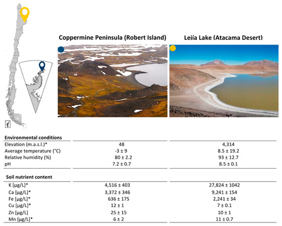 Two Chilean desert sites were selected for this study: Lejía Lake, located in the north of Chile, specifically in the highlands of the Atacama Desert, and Coppermine Peninsula, located in the extreme-south of the country, which is part of Robert Island in the Antarctic Peninsula. To characterize the physical–chemical features of these two Chilean deserts, we performed environmental measurements during sampling and subsequently identified soluble elements in the soil through TXRF. We observed that despite being obtained from distant environments, the environmental conditions of both soil sampling sites were not significantly different in temperature, pH, and humidity at the time of sampling (Figure 1). We expected that there would be no differences between these parameters because the sampling was performed under similar environmental conditions in both sites, after periods of constant rain, snow, and extensive cold, followed by thawing and the colonization of plant species [10,16]. However, when evaluating the chemical elements present in the soil, K, Ca, Fe, and Mn were significantly higher in Lejía Lake shore soil than in the Coppermine Peninsula. These values may have a biological explanation attributed to the activity and constant fumaroles of the Lascar volcano that is located immediately above Lejía Lake. These elements, among others, have been identified and quantified through Energy-Dispersive Spectroscopy (EDS) from samples of fumaroles collected in 2012 from the Lascar Volcano [37]. On the other hand, Cu measured in soil from Lejía Lake was double the amount measured from the Coppermine Peninsula, which is an effect that could be attributed to the structure of the rock that makes up the peninsula and to mechanical weathering according to the biological processes at this site [38]. In fact, this peninsula has its name due to the evident presence of Cu in the rocks [39].