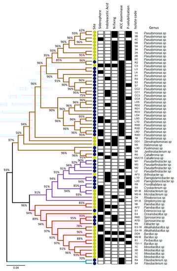 Bacteria with the capacity to contribute to plant tolerance to different environmental vicissitudes have been described in extreme environments [18]. These bacteria are defined as Plant Growth Promoting (PGP) and are related to the physiological modifications of the plant that allow them to better manage the harsh environments through the exogenous production of auxin, stimulating the elongation of adventitious roots or through the 1-aminocyclopropane-1-carboxylic acid (ACC) deaminase activity, which intervenes in the production of ethylene, inhibiting the response to senescence. Other mechanisms in which PGP bacteria also participate is in nitrogen fixation, phosphate solubilization, or siderophore production, all of which relate to the increase in nutrient availability in the soil [19]. Research has been carried out based on the use of PGP in agriculture to improve the yield of fruit trees, vegetables, and cereals [20] such as potato [21], wheat [22], soybean [23], apple [24], and tomato [25], among others [26,27]. However, the isolation and application of PGP from extreme conditions represents a rather unexplored scenario [28]. In this study, we isolated, identified, and characterized 71 soil bacteria from desert (Coppermine Peninsula and Lejía Lake shore), highlighting their similarities and differences attributed to their taxonomy, plant beneficial traits, and origin.