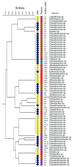 When compared to other studies carried out that isolated bacteria from soils under extreme environmental conditions in different parts of the world, our results were consistent with the isolation of mainly Proteobacteria, Firmicutes, Bacteroidetes, and Actinobacteria [40,41,42]. The most representative phylum corresponded to Proteobacteria at both sampling sites. A study conducted by Maza et al. [30] that analyzed the cultivable fraction of bacteria from Atacama Desert soil reported this same result, and a similar study developed by Gao et al. [43] through the isolation of bacteria from soil samples in arid and semi-arid sites in China described that Proteobacteria, Firmicutes, and Actinobacteria (in that order) were the most abundant phyla, while Bacteroidetes was less represented. The authors observed that this phylum seems to be more frequent in soils with better nutritional conditions; however, the phylum has also been commonly found in soils containing high concentrations of copper [44], which is consistent with the results presented above. In addition, studies carried out on other islands of the Antarctic Peninsula, specifically on Windmill Island [45] and King George Island [46], also reported that the most abundant phylum obtained from isolated bacteria corresponded to Proteobacteria.