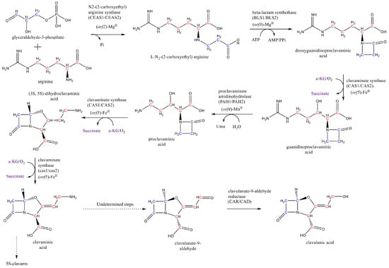 Subsequently, deoxyguanidinoproclavaminic acid, a β-lactam compound, is formed by intramolecular reaction of N2-(2-carboxy-ethyl) L-arginine by action of β-lactam synthetase (BLS) [11,12]. Enzyme clavaminate synthase (CAS) is a 2-oxoglutarate (α-ketogutarate) dependent oxygenase catalyzing three reaction of the clavam pathway, the first of them being the hydroxylation of deoxyguanidinoproclavaminic acid forming guanidinoproclavaminic acid [12,13]. The amidino group in the residue of arginine in guanidinoproclavaminic acid is removed by action of proclavaminate amidino hydrolase (PAH), producing proclavaminic acid [14,15]. Proclavaminic acid forms dihydroclavaminic acid following an oxidative cyclization mechanism in the second reaction catalyzed by CAS, which is followed by an oxidative desaturation catalyzed by CAS, yielding the (3S, 5S)-clavaminic acid [12,16]. At this point, the clavam pathway bifurcates into two branches, one leading to CA having clavulanate-9-aldehyde as intermediate, and the other producing several clavam 5S compounds. Notice that the 3S, 5S stereochemistry of clavaminic acid is conserved in the synthesis of clavams 5S; nevertheless, stereochemical inversion is required in the late steps leading to CA. Some authors suggested that N-glycyl-clavaminic acid might be an intermediate in the late steps of CA biosynthesis, which also would have a key role in the stereochemical inversion of 3S, 5S configuration into 3R, 5R of clavulanate-9-aldehyde and CA [17]. Clavulanate-9-aldehyde is finally reduced by the clavulanate dehydrogenase (CAD) into CA [18]. The three reactions catalyzed by CAS are rate-limiting steps and control the flux reaction along the clavulanic acid and 5S clavams pathways [19,20]. CA biosynthesis pathway is summarized in Figure 1.