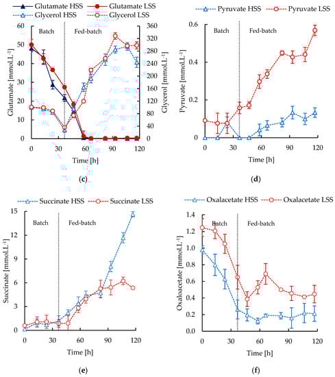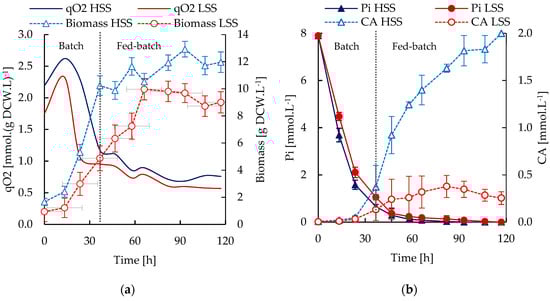 Experimental results of growth, CA, phosphate and metabolite secretion under high shear stress (HSS) and low shear stress (LSS) conditions are shown in Figure 2. The oxygen uptake (qO2), growth rate and CA accumulation were higher in HSS cultivations (Figure 2a,b). The maximum growth rates of S. clavuligerus observed at HSS conditions were 0.104 h−1 and 0.028 h−1 for the batch and fed-batch stages, respectively. These rates were slightly higher in comparison to the 0.102 h−1 and 0.024 h−1 values attained in the LSS cultivations, during the batch and fed-batch phases, respectively. At the end of the fed-batch operation, the maximum biomass was lower in the LSS cultivations (9 g.L−1) than the one observed at HSS (11.9 g.L−1). The glycerol and glutamate concentration time courses are presented in Figure 2c. Glycerol and glutamate, as carbon sources, were consumed rapidly during the exponential growth in the batch stage. Feeding of glycerol in excess (after 37 h) led to its accumulation during the fed-batch stage. The oxygen and carbon sources uptakes were consistent with the growth rates and biomass accumulation. The maximum uptake fluxes of glycerol at HSS and LSS conditions were 1.93 and 1.92 mmol.(g DCW.h)−1, respectively. Similarly, the maximum uptake fluxes of glutamate were 1.34 and 1.29 mmol.(g DCW.h)−1 during a short time span in the batch stage.