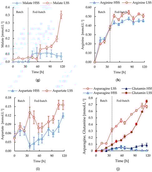 L-arginine (Figure 2h) is derived from L-ornithine, a non-proteinogenic amino acid, whose synthesis is induced under conditions of phosphate limitation [48]. HSS conditions promote a more active growth and higher nutrient uptake, leading to an earlier and more severe phosphate limitation, increasing the availability of L-ornithine and thus, L-arginine. The increased availability of GAP and L-arginine in HSS conditions led to a CA concentration almost 6-fold higher than the observed in LSS conditions. In contrast, the high pyruvate accumulation in LSS cultivation (Figure 2d) is a consequence of the decreased oxidative activity of the TCA cycle due to low intracellular oxygen availability linked to mycelia thickening.