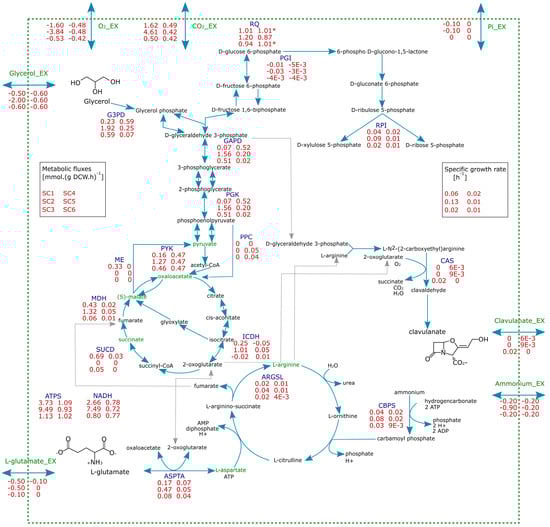 In scenarios of growth under glutamate and phosphate depletions (SC5 and SC6), the flux decrease in TCA and urea cycles was higher in the oxygen restricted scenario (SC6). In contrast, in SC3 and SC4 scenarios the constrained exchange flux of L-glutamate fueled the fluxes in the urea cycle. In SC5 and SC6 these fluxes were more dependent on glycolysis and TCA, leading to a drop in the fluxes of amino acids metabolism and hence, the CA pathway. Thus, in the oxygen constrained scenarios (SC4 and SC6), the slowdown of TCA and urea cycles, as well as amino acid metabolism and CA biosynthesis, predicted in silico, suggested that intracellular limitation of oxygen in LSS cultivations causes a general drop in fluxes along central metabolism, which correlates with the experimentally observed accumulation of pyruvate, oxaloacetate, malate, and amino acids. Moreover, as a physiological objective of growth, the use of oxygen is prioritized to sustain biomass synthesis and anabolism rather than specialized metabolite synthesis. The main carbon fluxes along central metabolism are summarized in Figure 3. FVA solution ranges for representative enzymes of central metabolism are shown in Supplementary Materials S4 and S5.