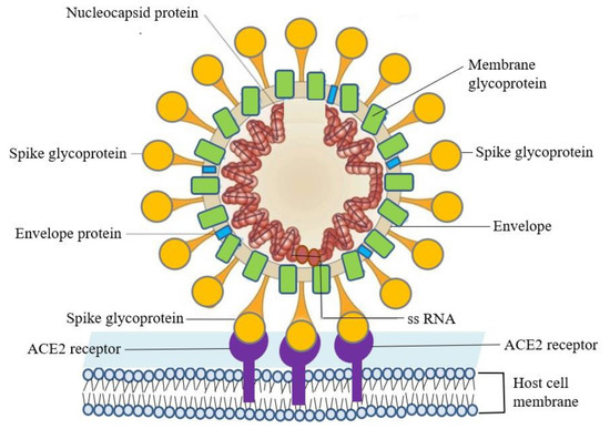 Figure 1. SARS–CoV-2 infects host cells through the specific binding of spike glycoprotein on the viral envelope and the angiotensin-converting enzyme 2 (ACE2) receptor on the host cell’s surface.