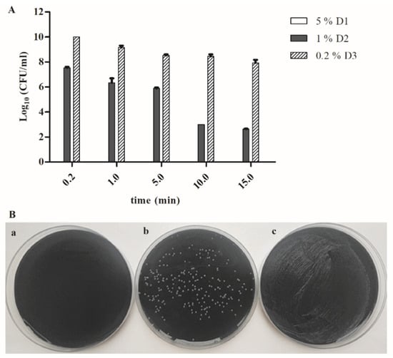 Furthermore, the number of the bacteria exponentially decreased over time, after the treatment with 1% benzalkonium chloride, DDAC and formic acid (D2), from 3.5 × 107 CFU/mL (10 s), 3 × 106 CFU/mL (1 min), 8 × 105 CFU/mL (5 min), 1 × 103 CFU/mL (10 min) to 4.3 × 102 CFU/mL (15 min) (Figure 1A,B).
