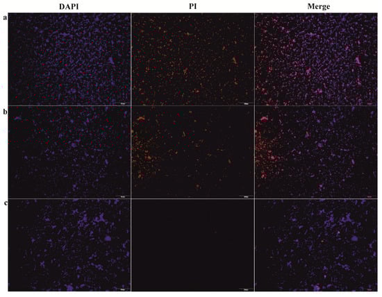 Live/dead viability assay. DAPI/PI staining of F. novicida treated with (a): 5% D1, (b): 1% D2, (c): 0.2% D3 for 5 min. Bacterial suspensions (100 µL) (OD = 1) were treated with 100 µL of different disinfectants, incubated at room temperature for 5 min and stained with PI and DAPI. The images were taken on a fluorescence microscope. Ten fields for each sample were randomly photographed.