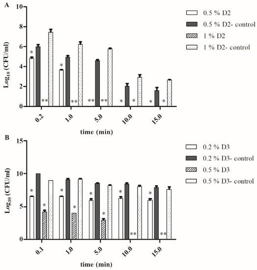 The bacterial viability of F. novicida grown in A. castellanii after treatment with (A): 0.5 and 1% D2. (B): 0.2 and 0.5% D3 for different time frames. A. castellanii was infected with F. novicida at a MOI of 10. After the incubation in amoeba, the intracellular bacteria were plated on a BCYE agar. The bacterial suspension (109 CFU/mL) of F. novicida grown in the amoeba was treated with 0.5 and 1% D2 or 0.2 and 0.5% D3 in a 1:1 ratio over different time periods: 10 s, 1, 5, 10 and 15 min. The numbers of the bacteria for each exposure time were determined by CFU on BCYE agar and compared with the control samples. The agar-grown F. novicida suspension treated with D2 or D3 solution was used as control. The results are representative of three independent experiments. The experiments were done in triplicate and error bars represent standard deviations. Student t-test, * p < 0.05, ** p < 0.001 were accepted as significantly different from control sample.