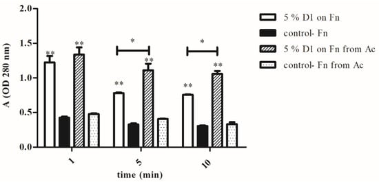 Protein leakage from F. novicida (Fn) and F. novicida isolated from A. castellanii (Fn from Ac), treated with 5% D1. The bacteria were treated with 5% D1 for 1, 5 or 10 min. The cells were centrifuged at 2700× g for 2 min and the proteins leaked in supernatants were measured as absorbance values at 280 nm. The supernatants of the untreated amoeba- or agar-grown bacteria were used as control. The experiments were done in triplicate and error bars represent standard deviations. Student t-test, * p < 0.05, ** p < 0.001 were accepted as significantly different from control sample.