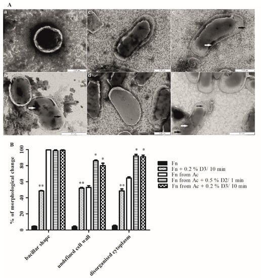 (A): TEM images of F. novicida (a), F. novicida treated with 0.2% D3 for 10 min (b), F. novicida after growth within A. castellanii (c,d), F. novicida after growth within A. castellanii treated with 0.2% D3 for 10 min (e), F. novicida after growth within A. castellanii treated with 0.5% D2 for 1 min (f). The bacteria were prepared for TEM by negative staining. The cell morphology was observed on samples in which around 50% of the bacteria were destroyed by disinfectants. Untreated amoeba-grown and agar-grown bacteria cells were used as control. The ten fields for each sample were randomly photographed. The thick black arrows show an undefined cell wall, the thick white arrows show clumping of the chromatin, thin black arrow shows separation of the cytoplasm from the cell wall. (B): Quantitative analyses of the morphological changes and membrane integrity of F. novicida (Fn) and F. novicida grown in amoeba (Fn from Ac) after treatment with disinfectants. Morphological changes were determined by electron microscopy counting at least 100 bacteria for each sample and using following criteria: (a) bacillar shape, (b) undefined cell wall, (c) disorganised cytoplasm. Student t-test, * p < 0.05, ** p < 0.001 were accepted as significantly different from control sample.