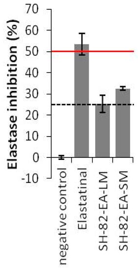 Preliminary screening on purified elastase identified three extracts with moderate activities (25–50% inhibition) as compared to a known elastase inhibitor, namely elastatinal (produced by actinomycetes). Only crude extracts from isolate SH-82 (Micromonospora fluostatini) exhibited sufficient inhibition of elastase activity (Figure 1). The ethyl acetate extract (SH-82-EA-SM) showed the highest inhibition by 32.5% at 100 µg/mL.