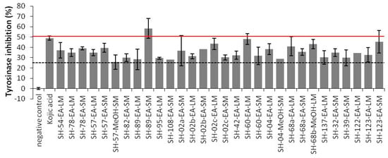 Percentage inhibition of tyrosinase activity by selected microbial crude extracts. Only the most active ones are shown. The code per isolates is outlined in Tables S1–S3. Bars, ±SD; n ≥ 2.