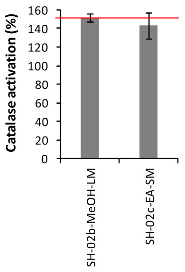 All extracts were screened on purified catalase, at the concentration of 10 µg/mL, in order to assess their antioxidant properties through the catalase activation. Four extracts (SH-02a-MeOH-SM, SH-02b-MeOH-LM, SH-02c-EA-SM, SH-02a-MeOH-SM) obtained from Bacillus strains exhibited promising antioxidant capability (activation average > 150). These extracts were selected for a secondary screening, leading to the validation of SH-02b-MeOH-LM (B. paralicheniformis) and SH-02c-EA-SM (B. paralicheniformis) as catalase activators (Figure 3).