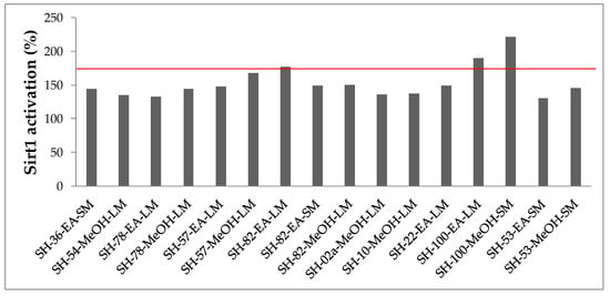 Activation rates of sirtuin 1 by selected microbial crude extracts. Only the most active extracts are indicated. The codes of the isolates are outlined in Tables S1–S3.