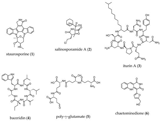 - Mondol, M.A.M.; Shin, H.J.; Islam, M.T. Diversity of secondary metabolites from marine Bacillus species: Chemistry and biological activity. Mar. Drugs 2013, 11, 2846–2872. [Google Scholar] [CrossRef]