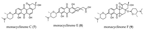 Another aspect of our future work will address strategies to activate cryptic genes with the aim of identifying new natural products. Indeed, investigation into the microbiome of Australian marine sponges by deep sequencing of NRPS (nonribosomal peptide synthetase) and PKS (polyketide synthase) genes found both NRPS and PKS biosynthetic pathways within Scopalina sp. microbiomes [101]. They further revealed within the microbiome of Scopalina sp. a great diversity of KS (PKS), the majority of which were trans-AT type and C (NRPS) domains. Trans-AT (trans-acyltransferase) type KS domains are an important group of PKS enzymes as they often lead to unique chemistry properties. Importantly, they identified the existence of novel biosynthetic pathways within these sponges, suggesting an untapped resource for natural products discovery. Products of PKS and NRPS pathways or hybrids of both represent a major class of the biologically active microbial natural products of interest to human health and industry. Surprisingly, few bioactive compounds were reported from Scopalina spp. In 2015, Vicente and co-workers reported the isolation of six new angucyclinone (aromatic polyketide) derivatives from a Streptomyces strain associated with S. ruetzleri [102]. Monacyclinone C (7) and E (8) exhibited moderate cytotoxic activities against rhabdomyosarcoma cancer cells, while monacyclinone F (9) showed the highest cytotoxic activity along with antibacterial property (Figure 6). This study represents the first report of the isolation of complex bioactive secondary metabolites from the genus Scopalina.