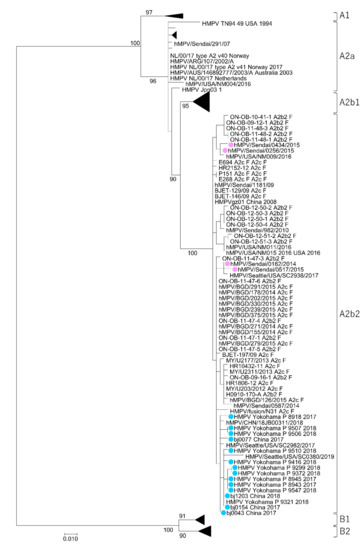 - Saikusa, M.; Nao, N.; Kawakami, C.; Usuku, S.; Tanaka, N.; Tahara, M.; Takeda, M.; Okubo, I. Predominant Detection of the Subgroup A2b Human Metapneumovirus Strain with a 111-Nucleotide Duplication in the G gene in Yokohama City, Japan in 2018. Jpn. J. Infect. Dis. 2019, 72, 350–352. [Google Scholar] [CrossRef] [PubMed]