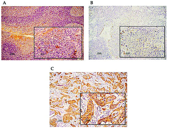 (A). SEMA3A in chronic tonsillitis tissue (magnification × 100, scale bar shows 100 µm, lower right rectangle × 400, scale bar shows 50 um). (B,C). SEMA3A was detected primarily in the cytoplasm of tumor cells (magnification × 100, scale bar shows 100 µm; lower right rectangle × 400, scale bar shows 50 µm) (B). Low level of SEMA3A expression (C). High level of SEMA3A expression.