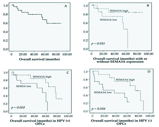 Comparison of different Kaplan–Meier curves for overall survival for patients grouped by immunohistochemistry levels of SEMA3A. (A) Kaplan–Meier curves for overall survival (OS) of the 32 OPC patients. (B) Kaplan–Meier curves for OS for OPC patients with low and high levels of SEMA3A expression (p = 0.035). (C) Kaplan–Meier curves for OS in patients who were HPV (+) with low and high levels of SEMA3A expression (p = 0.024). (D). Kaplan–Meier curves for OS in patients who were HPV (−) with low and high levels of SEMA3A expression (p = 0.016).