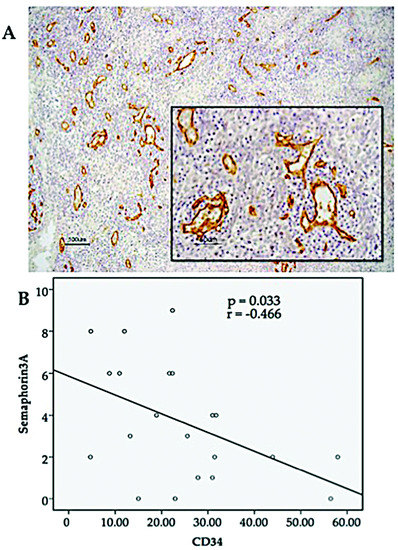 We next examined whether there was any correlation between the expression of SEMA3A and CD34 in OPC tissues using IHC analysis. IHC with CD34 antibody was performed on 21 OPC specimens (Figure 3A). We revealed that the expression score of SEMA3A and the number of microvessels (CD34) in OPC samples were negatively correlated (Figure 3B). These results support the hypothesis that SEMA3A acts as a tumor suppressor or angiogenesis inhibitor.