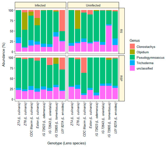 Relative abundance of fungal genera in the roots of diverse lentil genotypes in uninfected conditions (control) or when infected with the pathogen Aphanomyces euteiches, four weeks after seeding. The RootShield (RS) product contains T. harzianum T-22 and RootShield Plus (RSP) includes T. harzianum T-22 and T. virens strain G41.