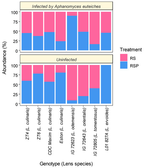 Relative abundance of Trichoderma at the genus level in the roots of diverse lentil genotypes treated with one of the two commercial biological products, in uninfected conditions (control) or when infected with the pathogen Aphanomyces euteiches, four weeks after seeding. The RootShield (RS) product contains T. harzianum T-22 and RootShield Plus (RSP) includes T. harzianum T-22 and T. virens strain G41. Significant effect of treatment on the abundance of Trichoderma was observed for both uninfected and infected plants with A. euteiches (p < 0.05).