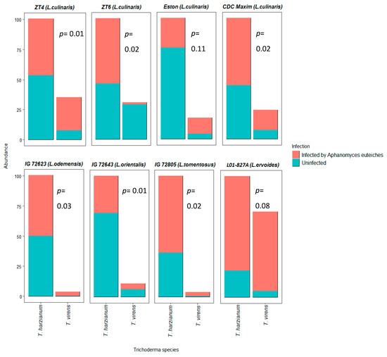The relative abundance of T. harzianum and T. virens, as determined by the identification of Trichoderma species found in the roots after inoculation with commercial RS or RSP products to each of the eight different lentil genotypes, when grown in uninfected conditions (control) or infected with the pathogen Aphanomyces euteiches (AE), four weeks after seeding. Relative abundance of Trichoderma significantly varied between species (p < 0.05). Statistics presented are the comparison of the uninfected/infected ratios between Trichoderma species for each genotype.