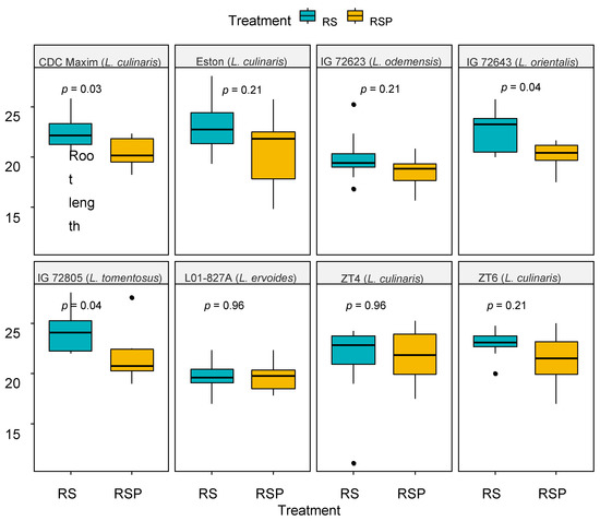 A greater increase in root length was observed in the plants treated with RS in comparison to those treated with RSP (p < 0.05), for example, as noted in genotypes CDC Maxim (L. culinaris), IG 7263 (L. orientalis) and IG 72 805 (L. tomentosus) (Table 4 and Figure 4). There was not a strong correlation observed between the growth of the lentil plants’ above- and below-ground parts, and the treatments with the different commercial product tested in the study (Table 4).