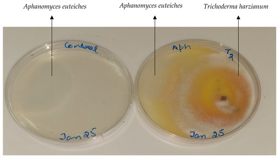 In vitro cultures of: left—Aphanomyces euteiches alone; right—bioassay of Aphanomyces euteiches and Trichoderma harzianum strain T-22 co-cultures. Five day old culture of A. euteiches and T. harzianum were used for the assay on water agar plates. Microbial growth showed is after 5 days of incubation.