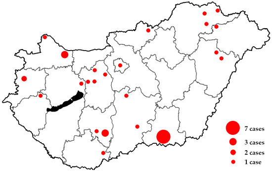 Spatial distribution of human S. suis clinical cases in Hungary (2002–2019).