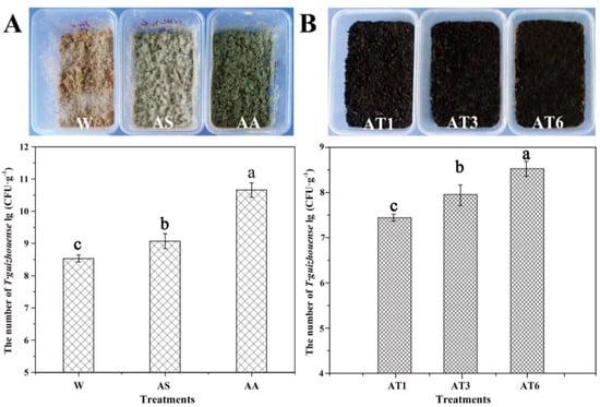 Preparation of Trichoderma guizhouense NJAU4742 solid spawn (A) and NJAU4742-based biological organic fertilizer (B). W means sterile water, AS indicates ammonium sulfate, AA is the treatment fortified with amino acid solution; AT1: 20% (v/w, dw) amino acid solution and 1% (w/w, dw) biological organic fertilizer (BOF) (w/w, dw); AT3: 20% (v/w, dw) amino acid solution and 3% (w/w, dw) BOF; AT6: 20% (v/w, dw) amino acid solution and 6% (w/w, dw) BOF. Data are repressed as means ± SDs of 3 replicates. Values with different letters in the same column are significantly different at p ≤ 0.05 according to Duncan’s ANOVA test.