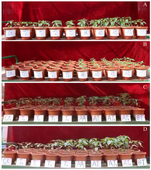 The prepared solid spawn (with more than 1010 g−1 dw conidia of NJAU4742) and BOF were mixed with the air-dried soils, and the treatments were as follows: T0: 10 g·kg−1 (w/w, dw) chopped rice straw with the size of 1–2 mm; T1: 10 g·kg−1 (w/w, dw) solid spawn; T3: 30 g·kg−1 (w/w, dw) solid spawn; T6: 60 g·kg−1 (w/w, dw) solid spawn; AA: 200 mL·kg−1 (v/w, dw) amino acid solution; AT1: 200 mL·kg−1 (v/w, dw) amino acid solution and 100 g·kg−1 (w/w, dw) BOF; AT3: 200 mL·kg−1 (v/w, dw) amino acid solution and 300 g·kg−1 (w/w, dw) BOF; AT6: 200 mL·kg−1 (v/w, dw) amino acid solution and 600 g·kg−1 (w/w, dw) BOF; BT: the Bacillus amyloliquefaciens SQR9-based BOF we produced (stored in our laboratory); CK: chemical fertilizer. All treatments contained equal concentrations of total nutrients, whose values are shown in Table S3. Pepper seeds (Capsicum annuum L.) used in this study were Sujiao No.1 obtained from the Jiangsu Academy of Agricultural Sciences. The seeds were disinfected with 70% (v/v) ethanol for approximately 1 min and then dipped into 20% sodium hypochlorite (NaClO) for 20 min, after which the seeds were rinsed with sterilized water at least four times. The sterilized pepper seeds were placed in darkness at 30 °C for 36 h on a sterile double layer of filter paper to ensure humidity for seed germination, and then the viable seeds were cultivated in nursery substrate for approximately 15 days. Well grown pepper seedlings were transplanted into different pots (200 × 180 mm, two seedlings in each pot) containing 3.2 kg of soil, with six replicates for each treatment. Different treatments were randomly distributed to avoid the influences of environmental factors; they were all given 15 h of light (21–28 °C) and 9 h of darkness (10–15 °C) per day, and the watering was arranged according to crop requirements.
