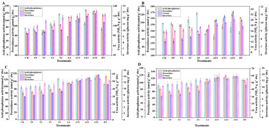The soil’s extracellular enzyme activities, including invertase, urease, peroxidase and acid phosphatase in sandy soil and mountain soil during two growth seasons. (A) the enzyme activities of different treatments in sandy soil during the FS; (B) the enzyme activities of different treatments in sandy soil during the SS; (C) the enzyme activities of different treatments in mountain soil during the FS; (D) the enzyme activities of different treatments in mountain soil during the SS.