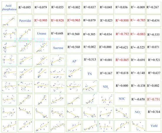 Linear correlation analysis was performed to evaluate the correlations among hydrolytic enzyme activities, nutrient contents, and pepper yield in different treatments (Figure 4). The relations between different parameters were evaluated by linear correlation analysis in the form of the slope and distribution. The results showed that peroxidase activity had a clear and consistent positive correlation with urease activity (r = 0.995, p < 0.01), invertase activity (r = 0.928, p < 0.01), AP (r = 0.965, p < 0.01) and SOC (r = 0.888, p < 0.05). However, the correlation was negative between the peroxidase activity and the content of NO3− (r = −0.785, p < 0.05). The correlation was positive between urease activity and SOC (r = −0.785, p < 0.05), whereas a negative correlation was found between urease activity and content of NO3−.