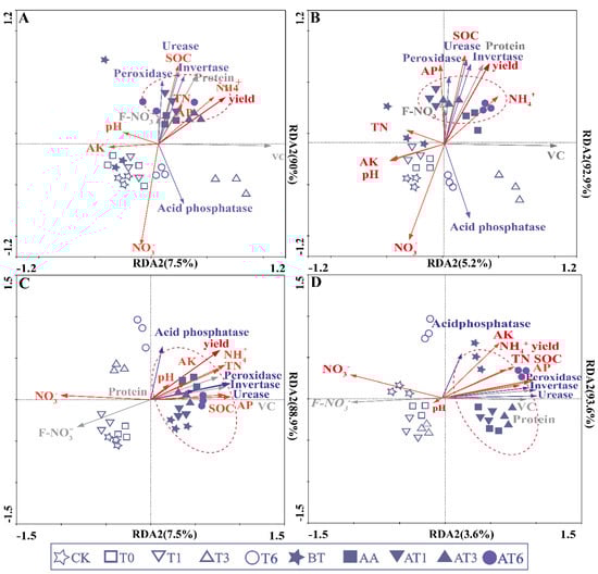 The RDA analysis of the pot experiments in the sandy soil of the FS and the SS is shown in Figure 5. Most environmental factors along axis 1 that increased (93.6% variation, 0.036 fitting variations) were positively correlated with SOC, TN, AP, pH and VC contents and negatively correlated with NH3+, NO3− and F-NO3− contents, and this axis was higher than that of any other variables, as indicated by the length and direction of the vector. The results showed lesser correlations among soil enzyme activity, TN, NO3−, AP, SOC, AK, pH and yields, which indicated a positive correlation between soil enzyme activity and other parameters. Additionally, the corner dimension showed that both soil enzyme activity and TN were positively correlated with yield. The arrow of AK was the shortest one of all parameters, indicating the minimum correlations were between AK and various soil enzyme activities. Fruit quality also presented a notable positive correlation with various soil enzyme activities. On the first axis, AT6, AT3, AT1 and AA were positively correlated with most of the enzyme activities, physicochemical factors and yields, and the correlation order was as follows: AT6 > AT3 > AT1 > AA. However, the results showed low correlations of T6, T3, T1, T0 and the CK with enzyme activities, physical and chemical factors and yields compared with those of BOF treatments. These results illustrated that the transformations of carbon and nitrogen in soil were closely correlated with enzyme activities by the application of NJAU4742-based BOF.