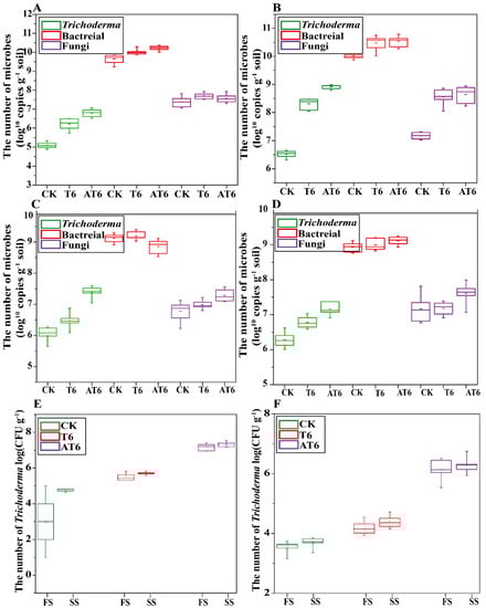 The numbers of bacteria, fungi and Trichoderma spp. in the mountain soil are shown in Figure 6C (FS) and Figure 6D (SS). The results indicated that the numbers of bacteria, fungi and Trichoderma spp. in each treatment of mountain soil were lower than those obtained in sandy soil during both seasons. The maximum logarithm order number (10.46, 8.92 and 8.61 during the FS and 7.42, 10.6 and 7.82 during the SS, respectively) of each microbe group was also obtained in AT6 during both seasons. The numbers of Trichoderma spp. in T6 and AT6 were increased by 2.4% and 20.1%, respectively, compared with that of the CK during the FS, whereas they increased by 5.87% and 13.0%, respectively, compared with that of the CK during the SS. No significant difference was detected for the bacterial number among the CK, T6 and AT6 in both seasons. The numbers of fungi in T6 and AT6 were increased by 5.61% and 8.23%, respectively, compared with that of the CK during the FS, and increased by 5.25% and 7.81%, respectively, compared with that of the CK during the SS. The number of Trichoderma spp. in the rhizosphere soil was also detected by the gradient dilution method to investigate the effective number of viable cells (Figure 6E (FS) and Figure 6F (SS)), and the results indicated that the highest number of Trichoderma spp. was obtained in AT6 in both seasons (6.96 in the FS and 7.42 in the SS), and the increases were 57.8% and 54.6%, respectively, compared with those of the CK during the two seasons.