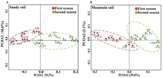 The physiochemical properties in the mountain soil during the two seasons in different treatments are shown in Table 4. The highest contents of SOC, TN, NH3+, AP and AK were obtained in AT6, except NO3−, with the increases of 31.30%, 17.95%, 130.59%, 122.59% and 26.85%, respectively, compared with those of the CK. The content of NO3− was gradually increased in the mountain soil during the two seasons, which was a different response than that in sandy soil, and the maximum NO3− content was obtained in the CK. When compared with the contents of different nutrients in AA during the FS, SOC, TN, AP, and AK in AT6 were increased by 7.4%, 24.2%, 12.0% and 15.8%, respectively.